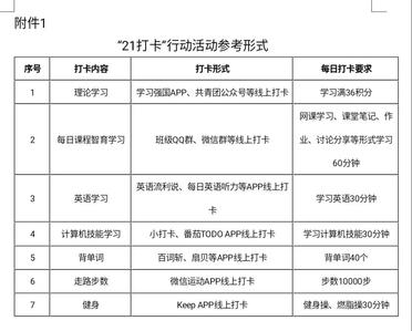 为激发学生主观能动性,促进学生做好时间、目标和行动管理,各班级开展一项或多项能够帮助学生养成良好习惯的“21天打卡”行动。直播平台 集中于4月24日-5月14日进行打卡活动,打卡内容多样。