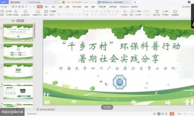 随后,2018级环境工程专业的周郁同学结合自己在四川广安渠江的实践经历,从实践背景、实践过程、实践成果与实践分享四个方面为同学们详细介绍了自己的活动内容,分享了活动经验。