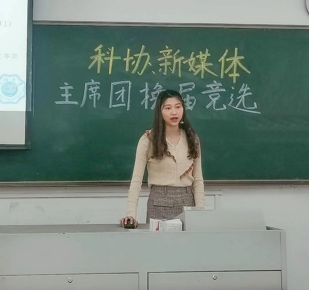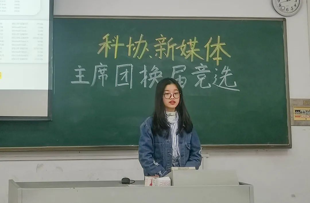 接下来进行的是新媒体中心的换届竞选。竞选主席的是2018级王莹同学,竞选副主席的是2019级林丽芳同学、2019级马梦瑶同学和2019级丁忆霏同学。各竞选人就自己要竞选的职务与自身能力、性格特色以及工作成果和未来的工作计划进行了详尽阐述。