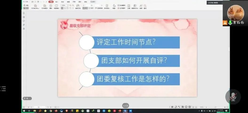 唐柏杨同学通过PPT的形式详细说明了星级支部评定的有关内容,并重点从评定工作时间节点、团支部如何开展自评以及团委复核工作三方面进行讲解,在讲解过程中也不时指出一些细节和要点,让与会人员对星级支部评定有了细致而深入的了解。