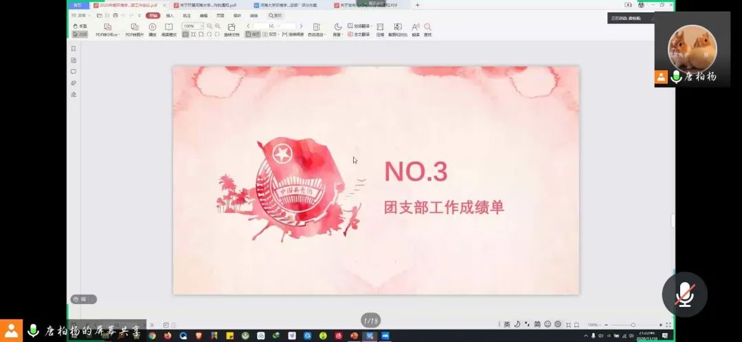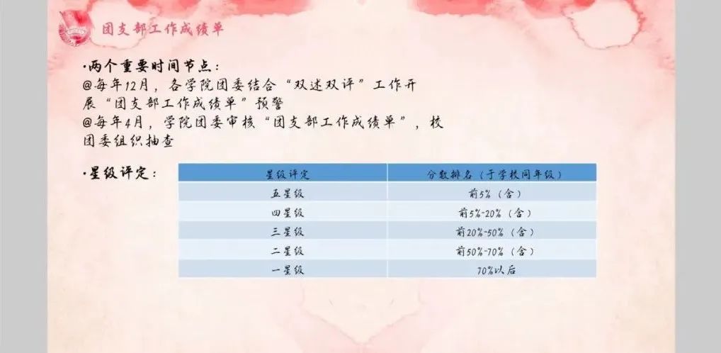 随着时间的推移,会议进入第二个重点内容:团支部工作成绩单。结合文字和图片,唐柏杨同学就团支部工作成绩单的实施细则、具体操作、注意事项以及其重要性阐述了团支部工作成绩单的相关工作内容,图文并茂的讲解让会议内容更加深入人心。
