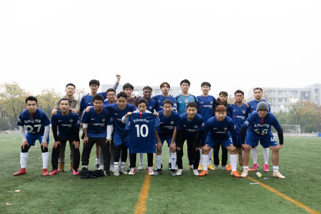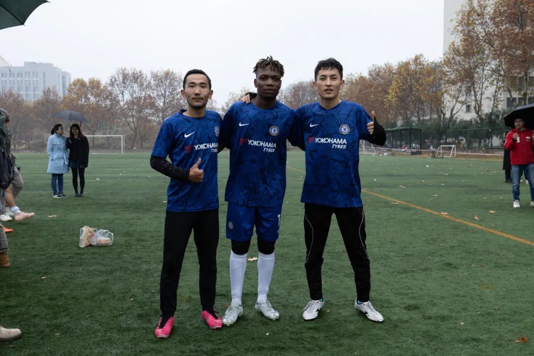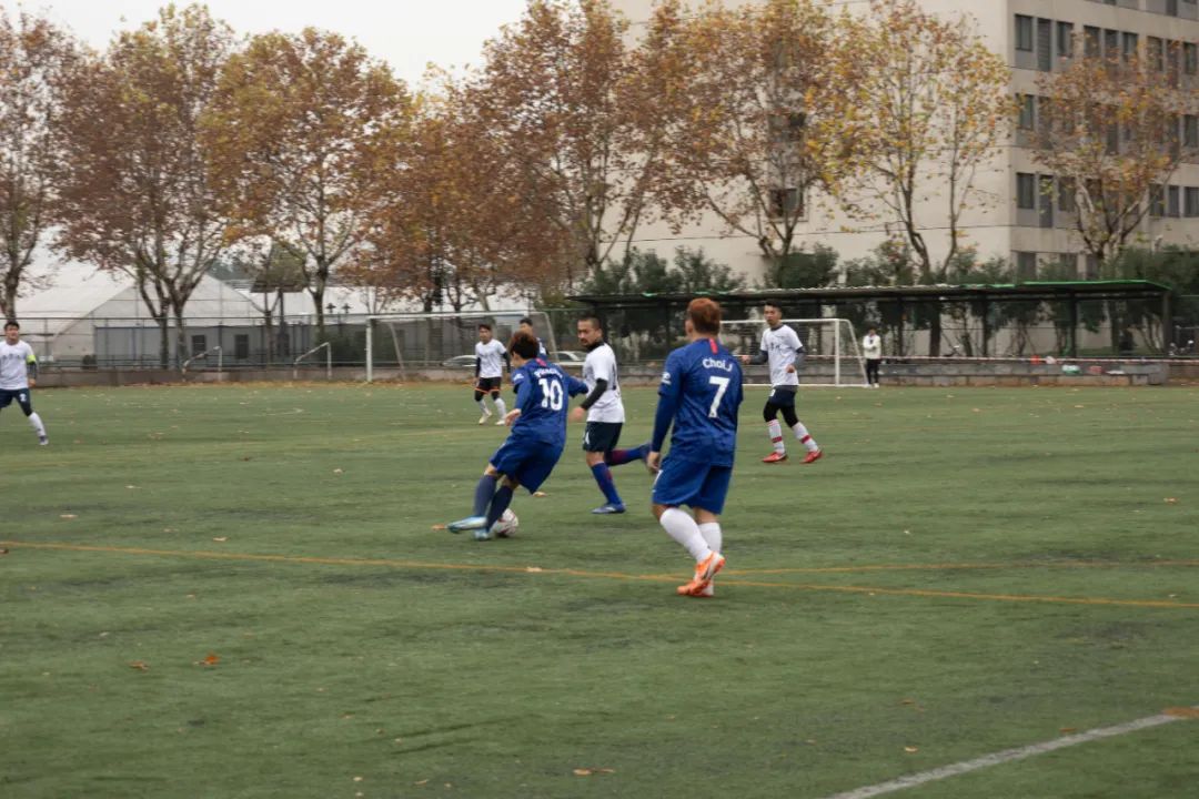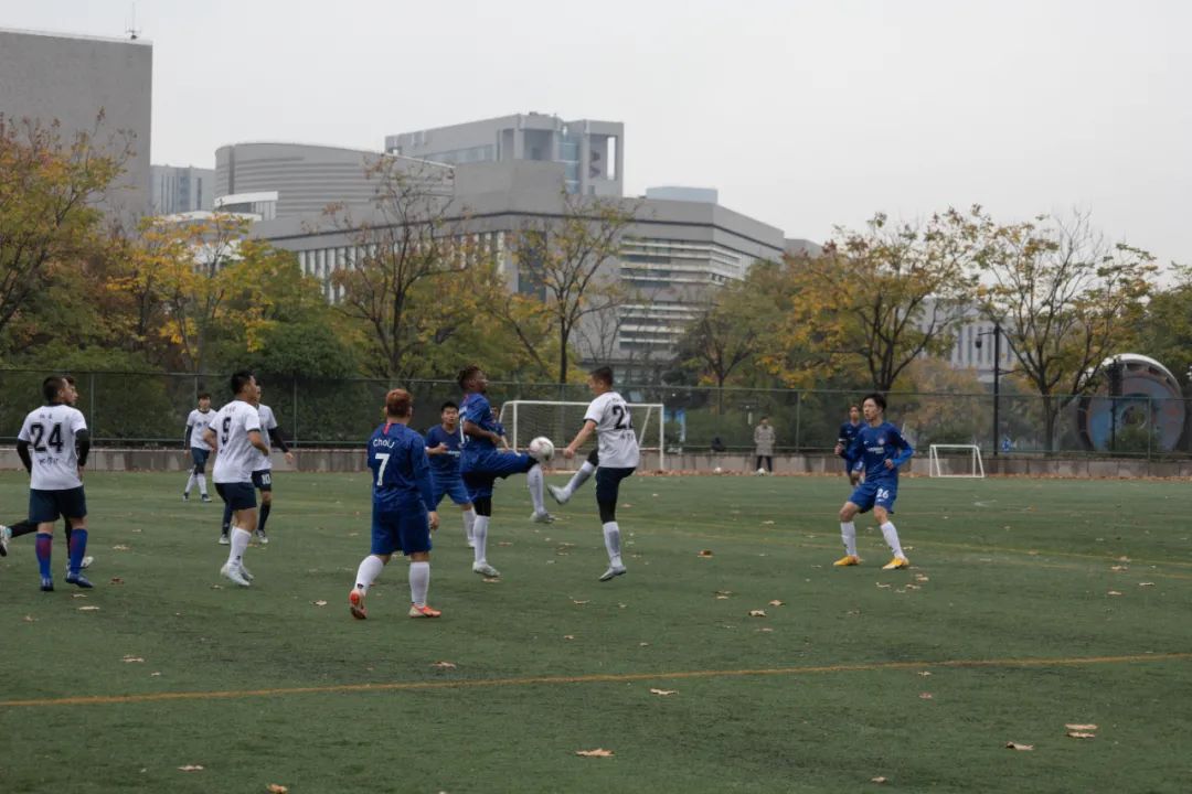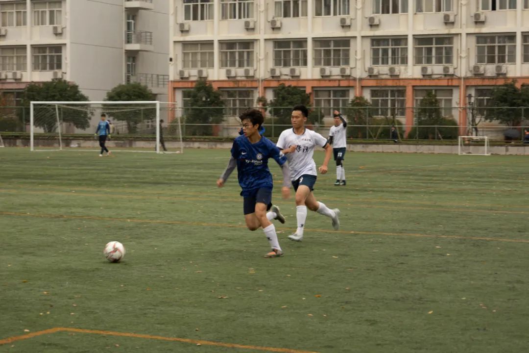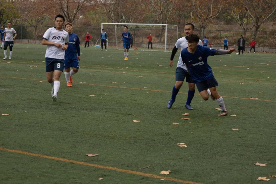 上半场比赛一开始,身着蓝色球衣的环境院球员们便与穿着白色球服的地直播平台的球员们展开了拉锯战。控球、传球、过人、防守、射门、扑救,球员们在绿荫场上奋力地奔跑,彰显着青春的风采。最终,在裁判的又一声哨响后,上半场比赛结束,球员们进入休息阶段。