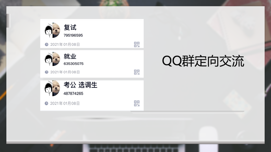 2020下半年受到疫情影响,秋季校园招聘无法顺利展开,故2021年春季校招成为同学们积极就业一大机会。陈老师结合近几年的数据,分析了2021届毕业生的就业情况。向即将毕业的2021届学子在就业问题、就业单位、就业城市等方面进行了介绍。并展示了直播平台 建立的考研复试、就业交流、公务员选调生交流群,为同学们提供了一个交流信息的平台。
