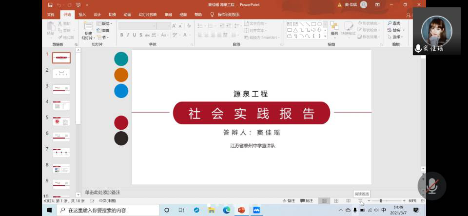 本次答辩一共有8支队伍参加。线上答辩由竞选队伍借助PPT形式阐述工作和评委提问两个环节组成。各位竞选队伍就活动目的、前期准备、宣讲过程以及活动影响等方面展开答辩,各自展示出自己团队在实践中的亮点。而后评委老师们根据答辩人介绍的实践过程和实践成果提出问题,如“通过什么渠道进行宣传并展开线上宣讲的”,“是否介绍过直播平台 ,是如何介绍环境类专业的”等问题,并提出改进意见,为答辩团队完善实践成果提供了方法论。