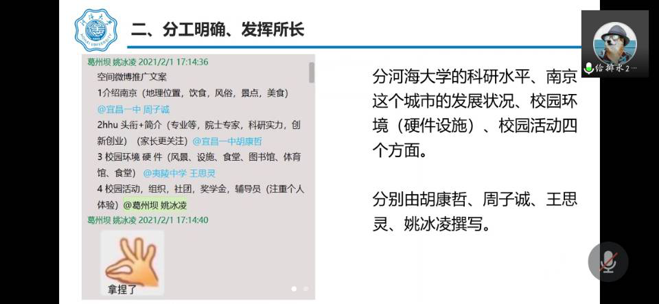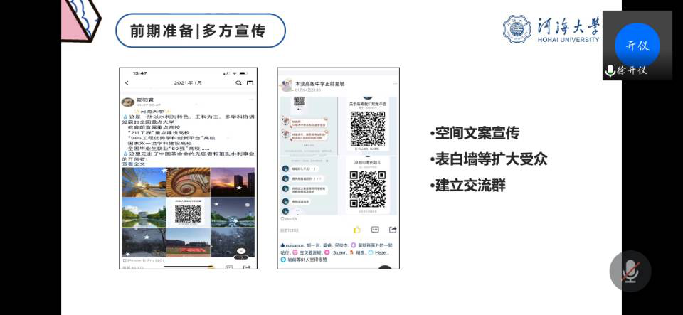 第八组在线下发放宣传材料和充分宣传了河海大学之后通过腾讯会议开展了线上宣讲,进一步提高了河海大学的知名度,传播了河海文化,弘扬了河海精神。针对各个团队在实践以及答辩中的一些细节,评委老师们也耐心的提出问题和建议,引导同学们继续改进,做出更加优秀的实践成果。