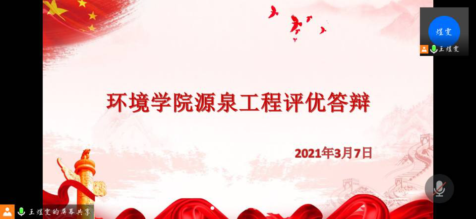2021年3月7日下午,河海大学直播平台 举办了“源泉工程”线上评优答辩。本次答辩由2020级给排水科学与工程2班王煜雯担当主持人,院团委书记金意倩老师、2020级辅导员杨铮老师、院团委副书记唐柏杨、往届寒假实践优秀获得者吴建宇以及唐国涛担任评委。